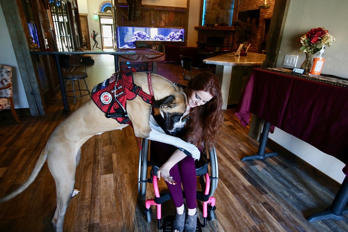 Her service dog, a 135-pound, three-foot-tall Great Dane named Ali-Bama (a nod to Alabama, where Burdett is originally from, and she is a diehard Crimson Tide fan), is at her side, watching until she feels her master is fine, and disappears behind the desk.