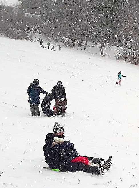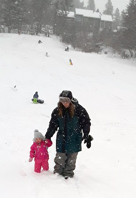 “Kids and snow,” Dylan Ogle of Coeur d’Alene said after taking a sledding run down Cherry Hill Monday, along with his son and nephew. “Our kid’s only 16 months [old]. He doesn’t like it very much.”