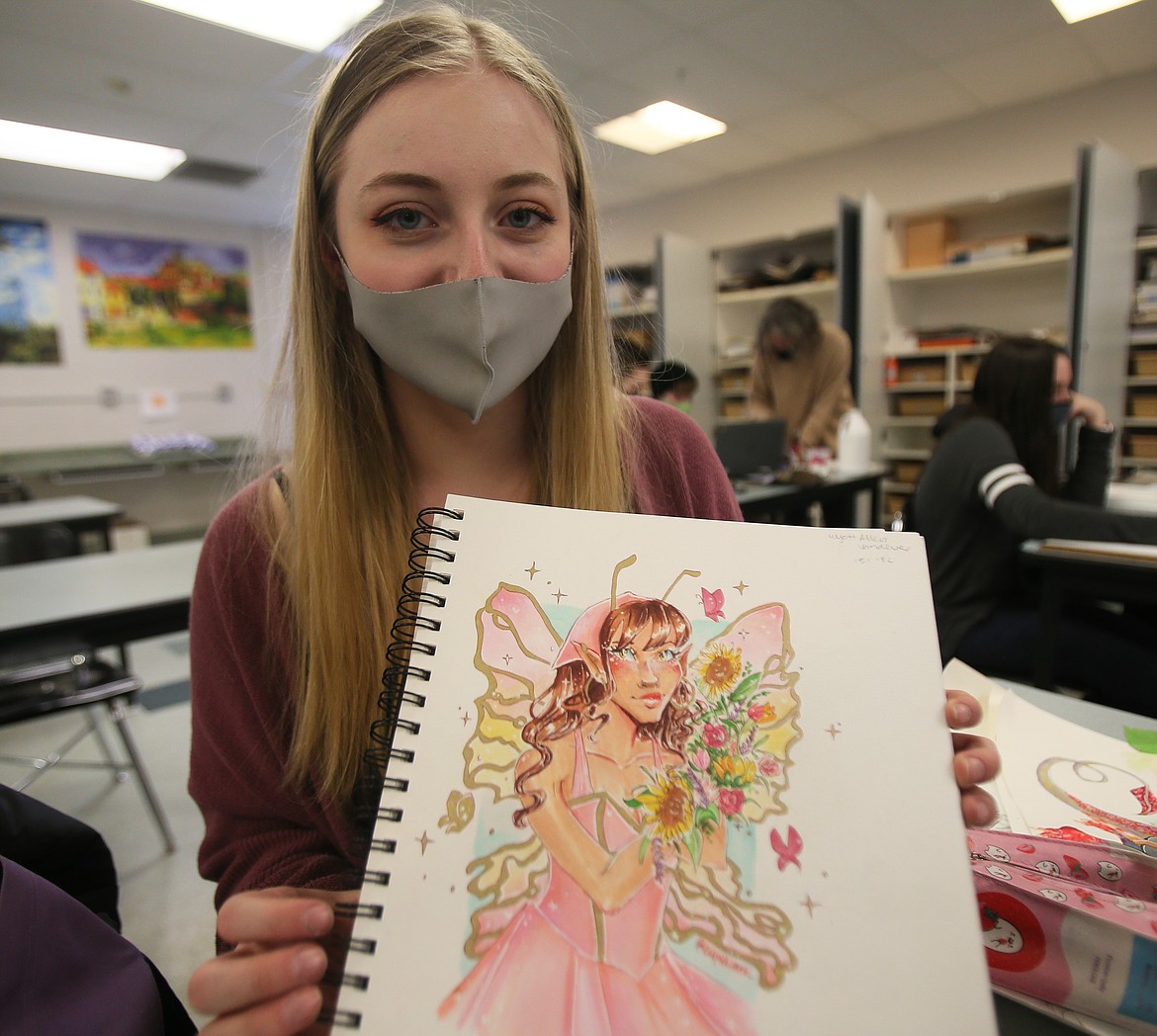Kuhns' class is also working on a collaborative project with fifth-graders at Sorensen Magnet School of the Arts and Humanities. For this project, junior Sophia Granger was working on an illustration of a dragon with brilliant red wings.