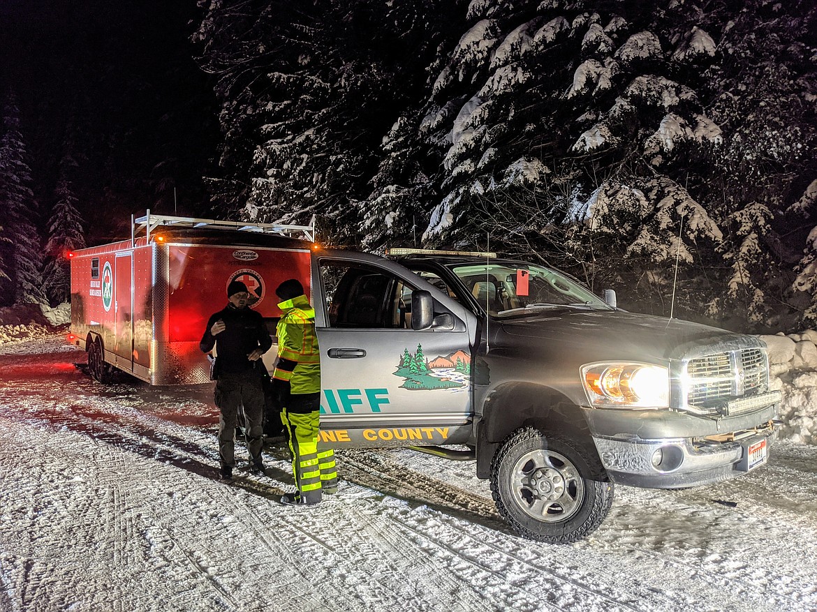 Search teams comprised of six SCSO deputies, 10 SVSR personnel, and the original snowmobilers set up a command post at the base of Dobson Pass and orchestrated rescue efforts from there. Air support from Two Bear Air from Montana had been requested, but was called off before they could arrive.