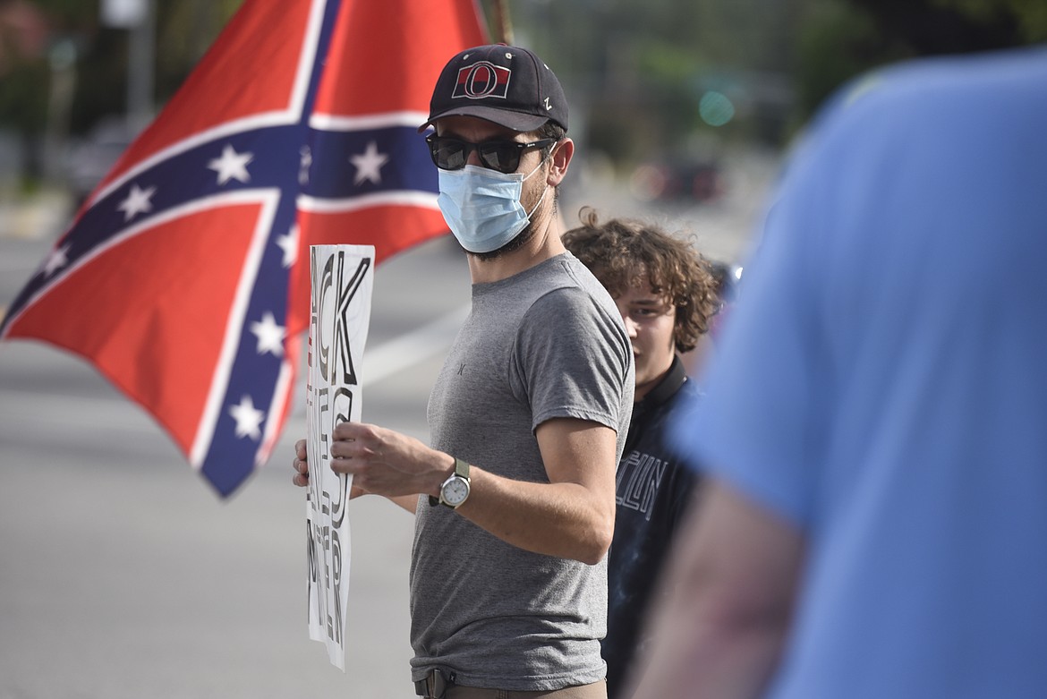 Across California Avenue, Dave Patterson, Clay Benefield and Keiton Julson stood beside a Trump banner in a show of support for the president. The trio said they supported the Black Lives Matter movement but opposed antifa, a group partially blamed for the violence that has marred similar demonstrations.