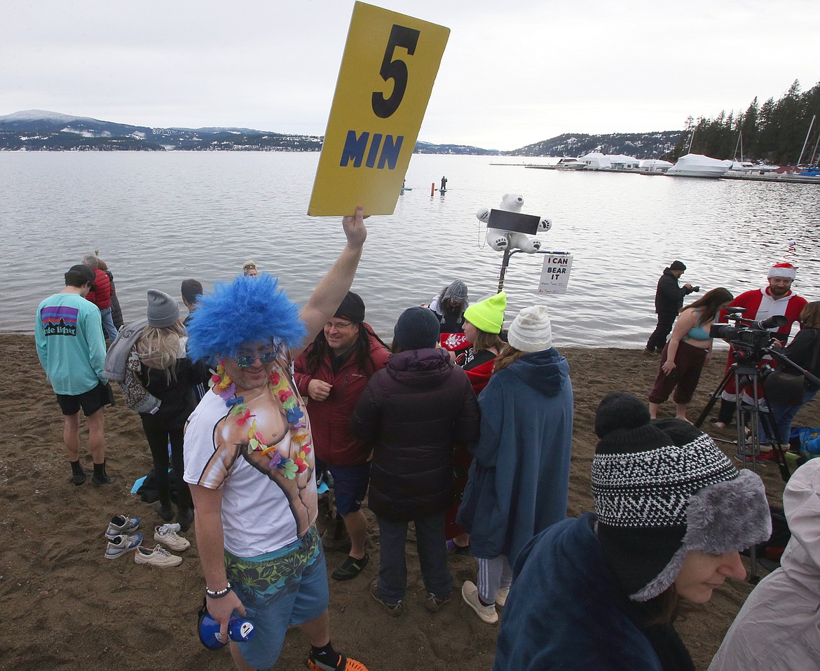 “Twenty minutes,” shouted Chad Bennett, the 25-year unofficial official organizer, who brought countdown placards, a timer, a stuffed polar bear and a sign that read “I can Polar Bear it.”