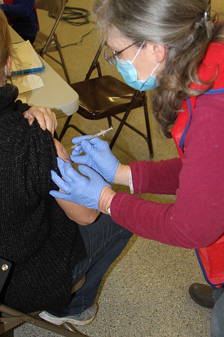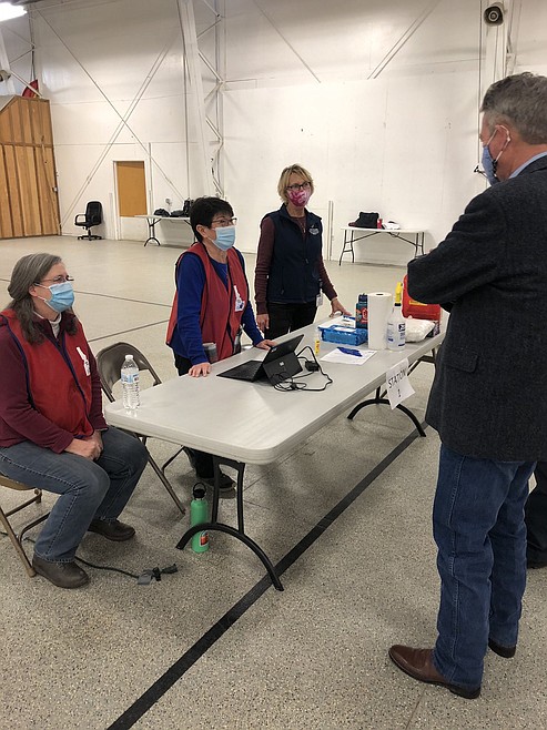 Friday's clinic was for essential workers who had already received their initial dose of the novel coronavirus vaccine. It was an orderly affair in which an Idaho State guardsman checked people's temperatures with a digital thermometer as they came in as people waited in socially distanced folding chairs. After receiving the doses, which were administered by the North Idaho Medical Reserve Corps, people waited 15 minutes to ensure there were not adverse reactions to the vaccine.