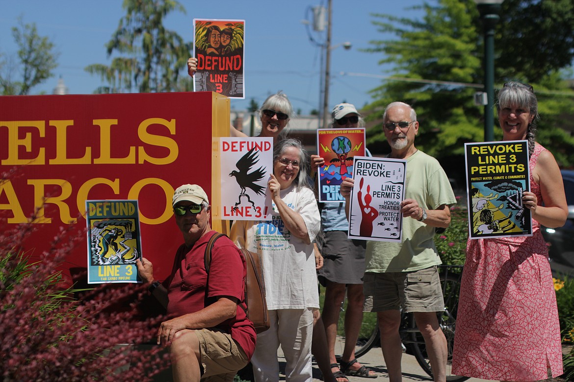 A small group of local protestors are joining a national movement to oppose the Enbridge Line 3 tar sands oil pipeline, which is being constructed through northern Minnesota and wetland treaty territory that provide water and wild rice for Native Anishinaabe (Ojibwe) people.
