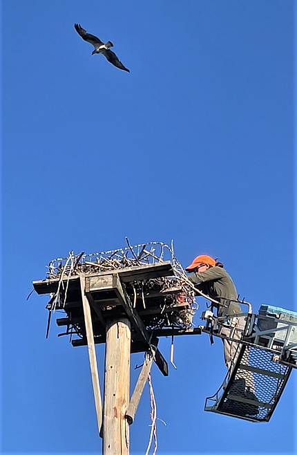With ORI leader Denver Holt in Alaska working on a decades-long owl research project, the crew consulted with osprey expert Rob Domenech at Raptor View Research Institute in Missoula and Brooke Tanner, raptor rehabilitation specialist at Wild Skies Raptor Center in Potomac. Everyone agreed that they needed a lift quickly to get to the nest 35 feet up and remove the twine.