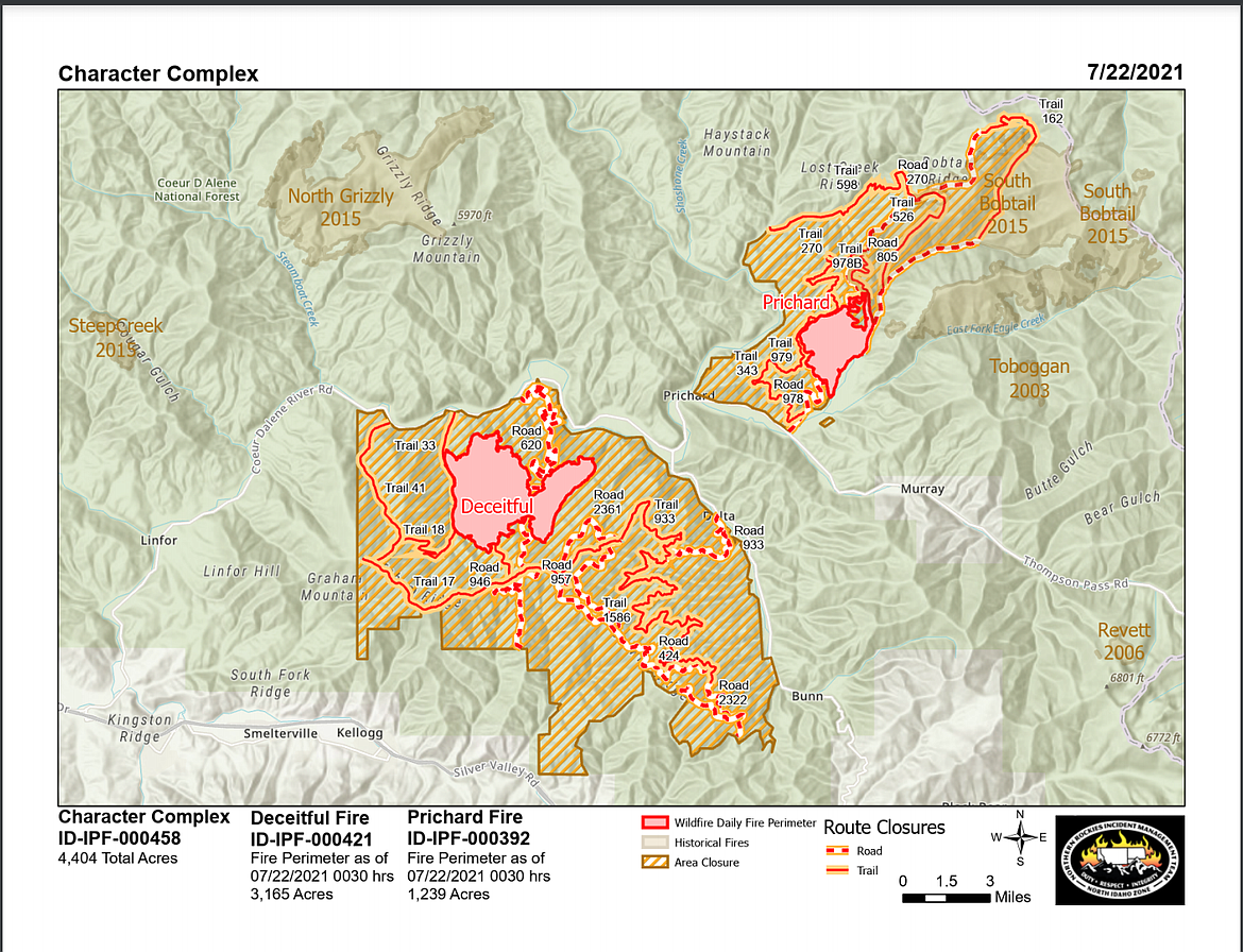 Road, trail, and area closures are in effect on Idaho Panhandle National Forest lands around the fire areas. Closure orders and maps are posted on InciWeb and the Idaho Panhandle National Forest Facebook page. The Shoshone County Sheriff’s Office has closed the following roads: Eagle Creek Road, Montgomery Ridge Road, and Bobtail Road at Prichard Creek for the safety of private landowners and firefighters working in the area.