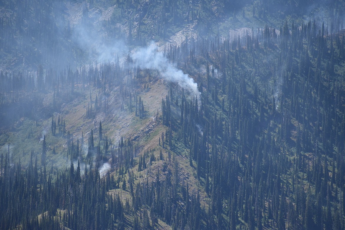 The Burnt Peak Fire, started by lightning on July 7, is burning in timbered, steep terrain on the south face of Burn Peak, about 9 miles southwest of Troy. The fire has burned 2,242 acres and is 19% contained, with containment estimated in late September.