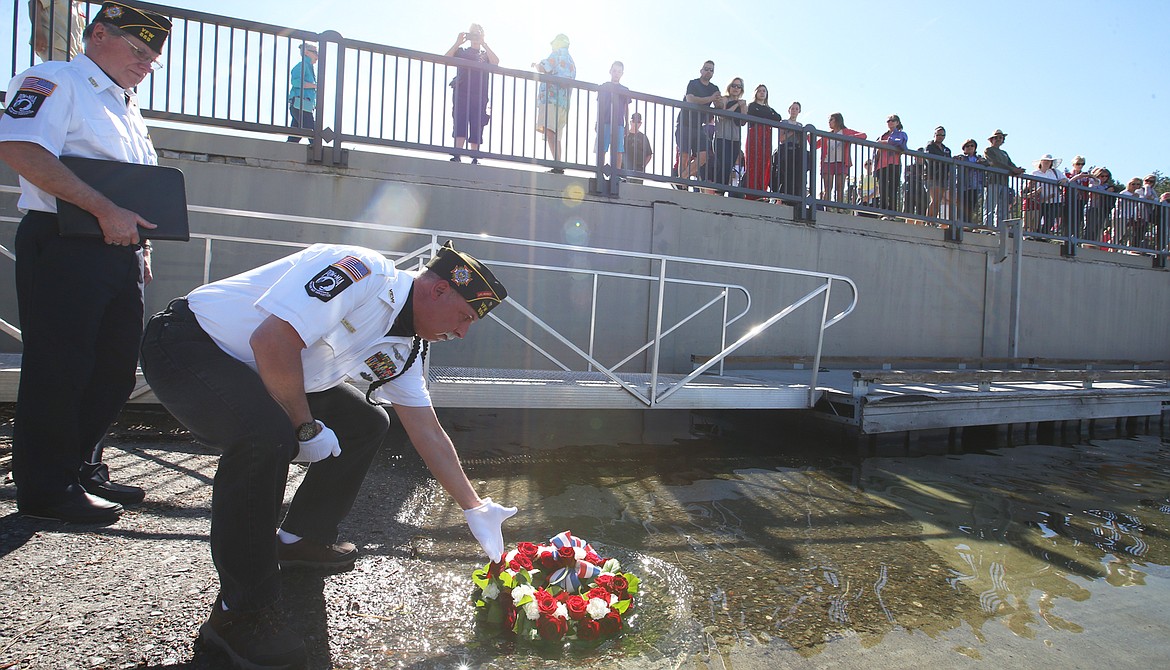 Veterans Pat Shelly and Dennis Watson carried the wreath to the shores of Lake Coeur d’Alene. Shelly set it in the water and gave it a push as a crowd watched.