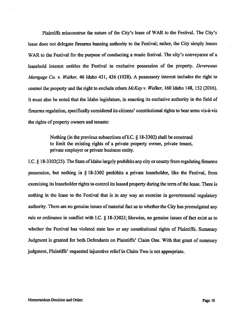 “It must be noted,” he wrote, “that in the Idaho legislature, in enacting its exclusive authority in the field of firearms regulation, specifically considering its citizens’ constitutional rights to bear arms vis-à-vis the right of the property owners and tenants … nothing prohibits private leaseholders, like the Festival, from exercising its leaseholder rights to control its leased property during the term of the lease.”