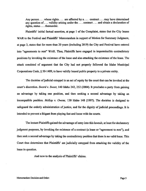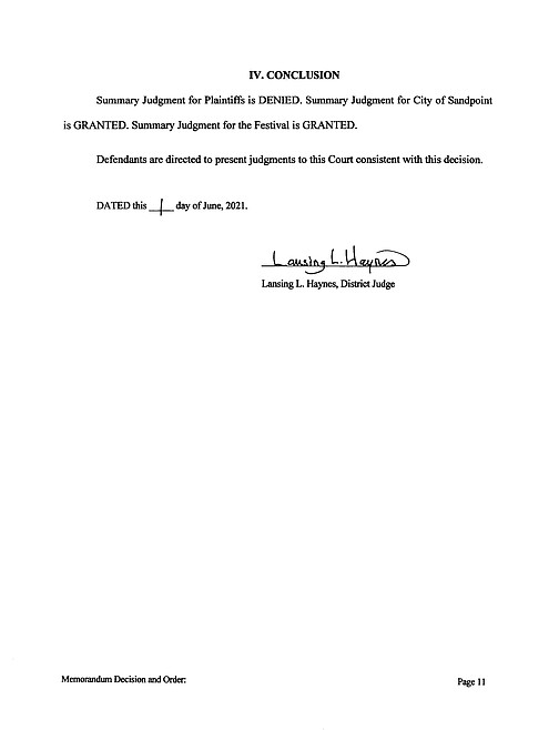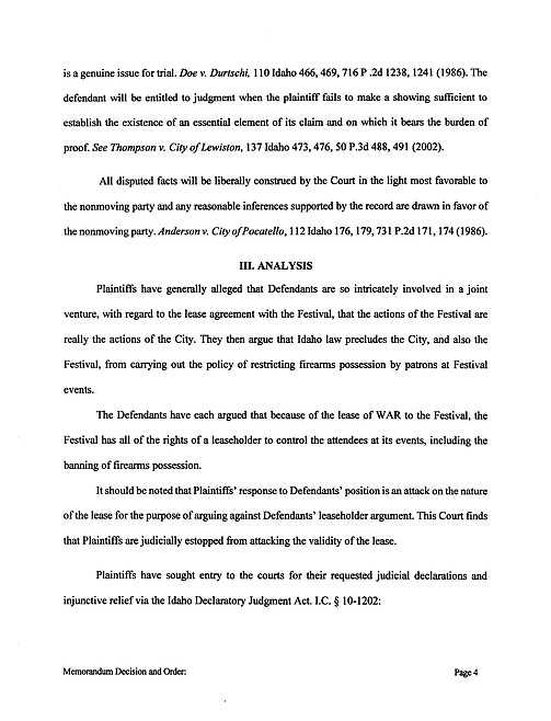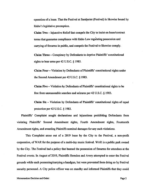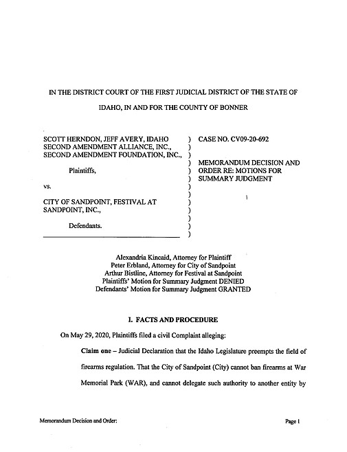 Judge Lansing Haynes of the First Judicial District Court granted a request for summary judgment by the city of Sandpoint and the Festival at Sandpoint Tuesday evening, denying a competing request for summary judgment by the plaintiffs Scott Herndon, Jeff Avery, the Idaho Second Amendment Alliance, Inc. and the Second Amendment Foundation Inc.