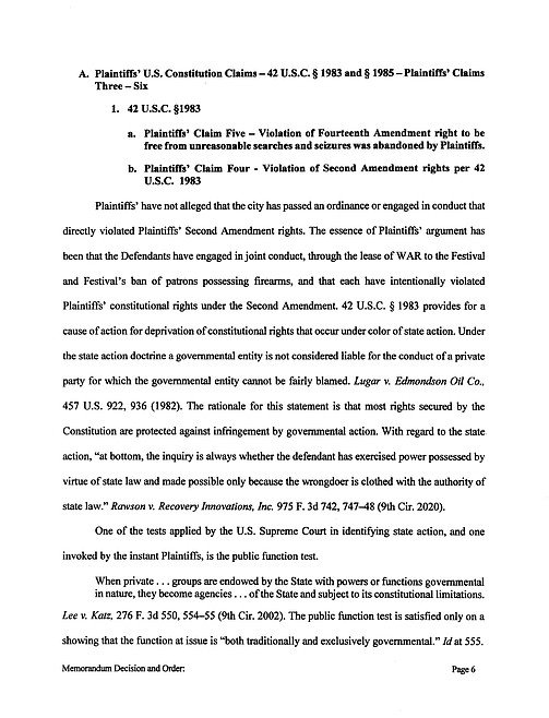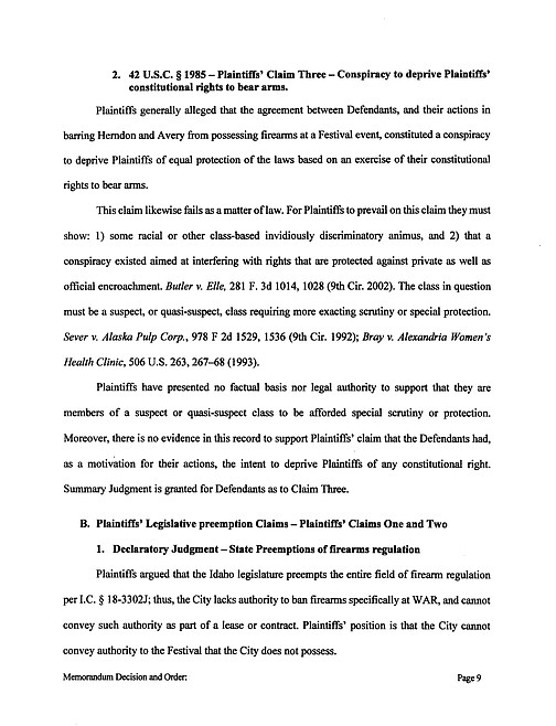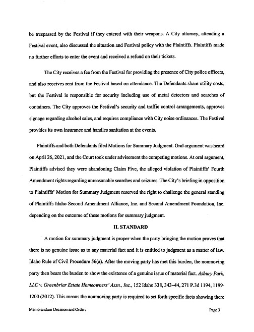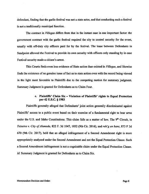 In the decision, Haynes wrote plaintiffs’ allegations that the city and Festival had intentionally violated their Second Amendment rights were unwarranted, as Idaho law states governmental entities cannot be held liable for the conduct of private entities.