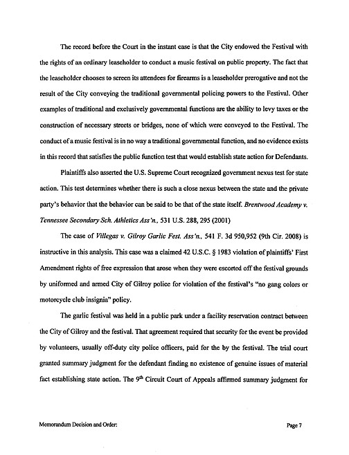 Plaintiffs had argued that because the city and the Festival acted closely in regards to the summer music series, the Festival’s decision could be argued to be that of the city’s. However, Haynes wrote, the Festival provided its own security, with police only standing by in case of the need for security to make a citizen arrest.