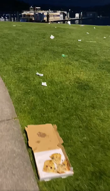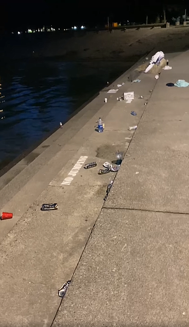 One video showed Independence Point at nightfall, where the sidewalks and concrete were littered with half-eaten pizzas, empty boxes of alcoholic seltzer cans, discarded towels and clothes, wrappers and empty food containers.