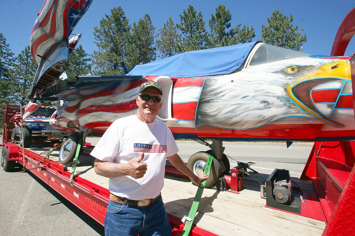 So much that he’s hauling a 1955 tactical fighter beautifully painted in red, white and blue, and with a screeching bald eagle, and a 1997 Jeep Wranger, also in patriotic colors, around the region.