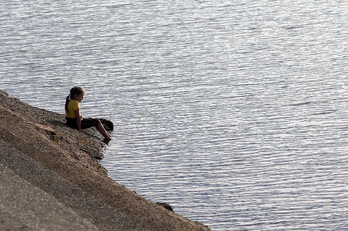 Sisters Rowyn and Hadley Black Eagle-Seres collected rocks from the shallow waters near the shoreline, then carried them out on the steps of Independence Point and launched them into the lake.