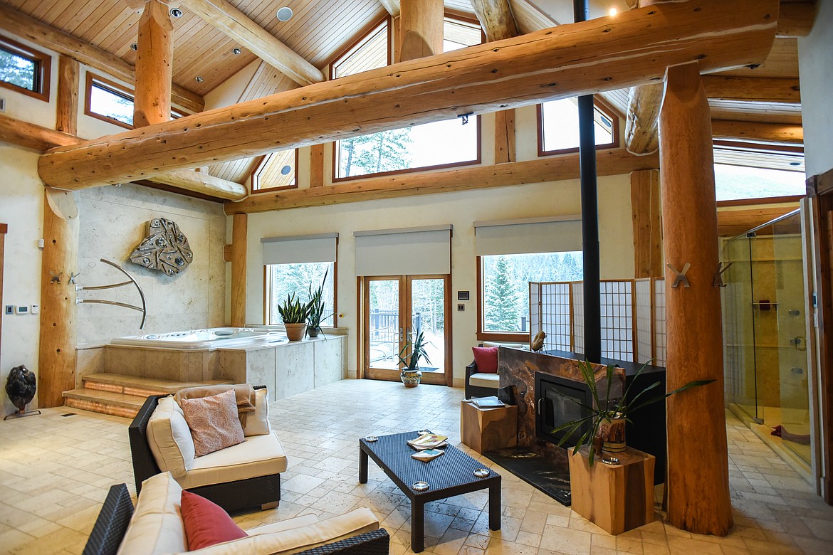 The main spa center is at least 3,000 square feet in size and features Canadian log accents, towering ceilings, an ornate waterfall centerpiece, vast windows that offer views of Grave Creek and a large deck with a jet pool. No expenses were spared in its creation.