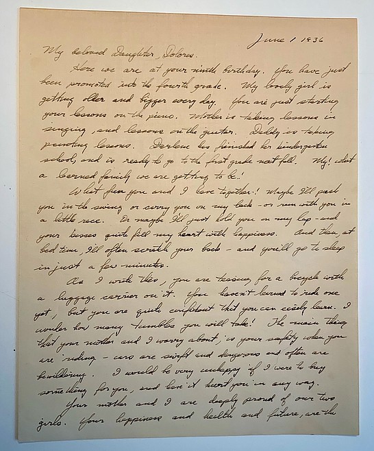 The yellowed paper is dated "June 1, 1936." It's addressed to "My beloved Daughter, Dolores."