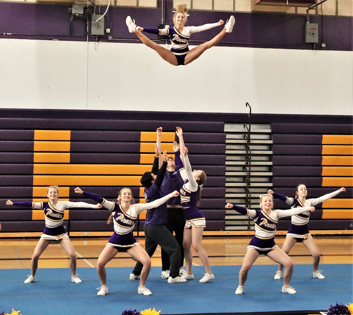 The Pirates’ competitive cheer team recently traveled to basketball divisionals in Butte and the state tournament at Great Falls, where they wowed the crowd with feats of strength, balance and aerial mastery.