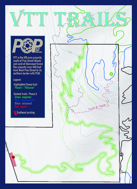 Buildout of VTT trails is expected to unfold in two phases between March 2021 and June 2022. The first phase includes a beginner arterial trail and trailhead parking area while the second phase will include construction of several shorter trails branching off the main trail to give mountain bikers, hikers and runners a variety of loop option within the property. Signage would take place during the project’s second phase, according to the POP website.