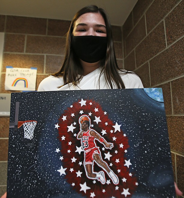Athlete, sports fan and senior Brooklyn Rewers let her imagination drift into outer space when she created a unique acrylic depiction of a familiar image: Basketball hero Michael Jordan and his legendary slam dunk.