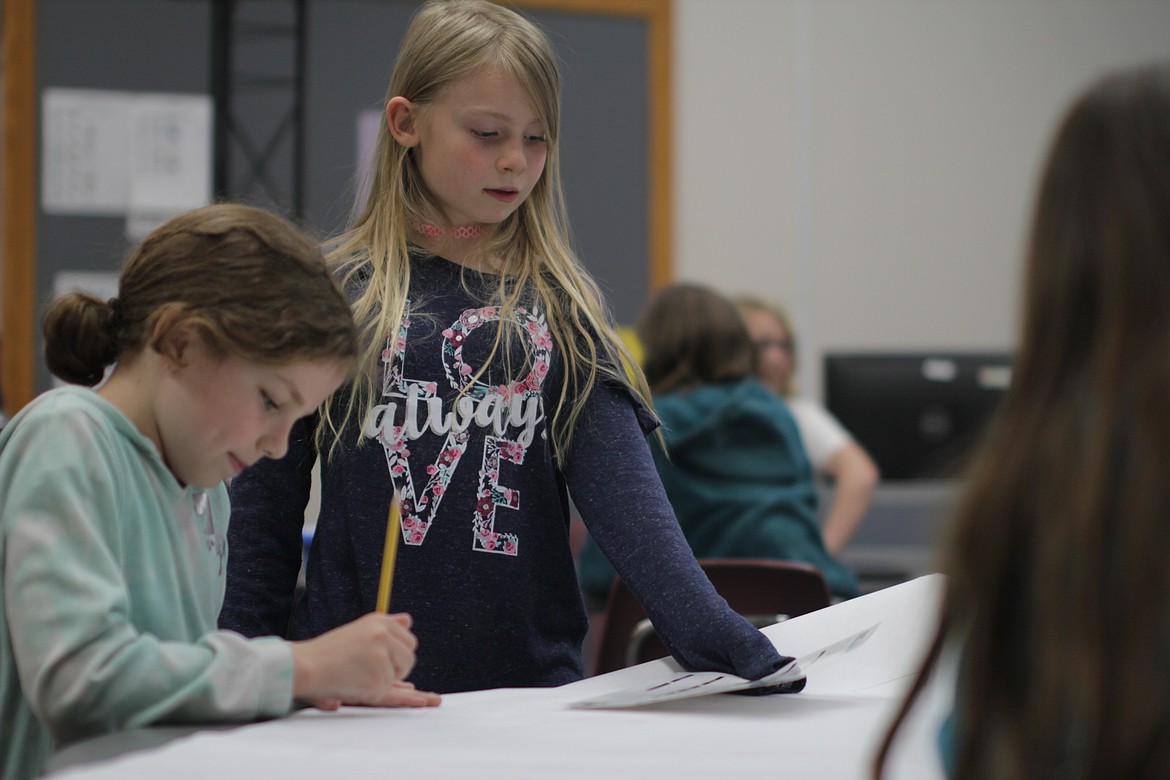 At another station, children learn about circuitry, and at a third, students draw mazes on large sheets of paper, where a robot will run through at varying its speed depending on the color marker used for the lines.