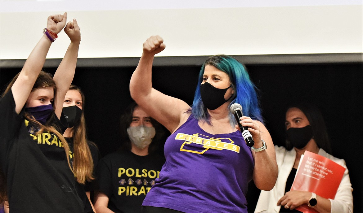 Kelly announced that she would return to her classroom the following week and attend in person for the remainder of the school year. She brought a gift with her on stage, a flowering plant and a big hug for fellow coach Melesa Butler, a special education teacher at Polson Middle School.