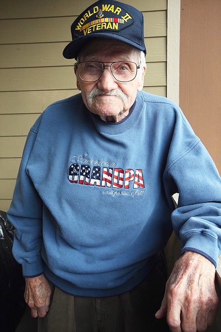 He’s wearing a blue hat that reads “World War II Veteran” in bright yellow letters with a pin and patches honoring his service.