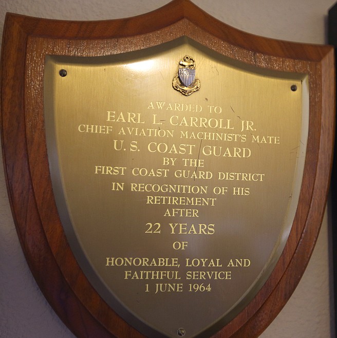 Photos and plaques are displayed, offering a glimpse of his 22-year Coast Guard career.