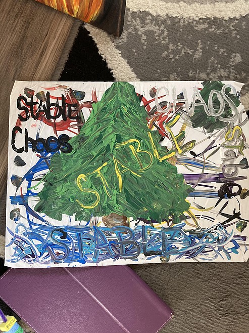Each painting is unique, and most of them are still in process. Some have words written over them, showing a struggle and path of thoughts.