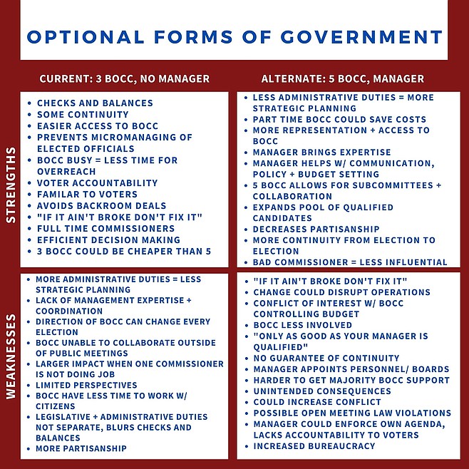 As part of the final recommendation, the OFGSC identified the pros and cons of implementing change during the Wednesday meeting. Most of the discussion focused on comparisons between a three-member board of county commissioners (BOCC) and the proposed five-member board.