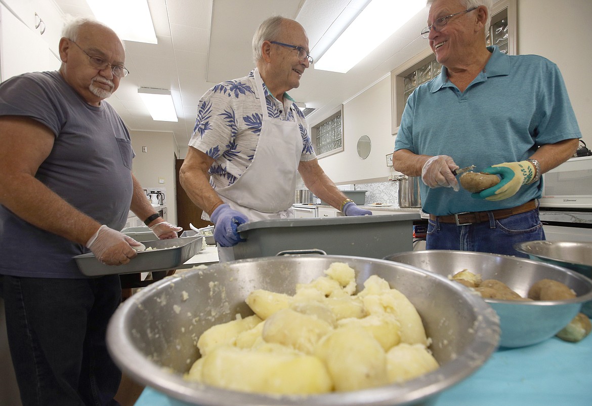 It’s a long process that starts downstairs where the men boil, peel, rice and cool potatoes. They’ve been at it since Tuesday, about five hours a day.