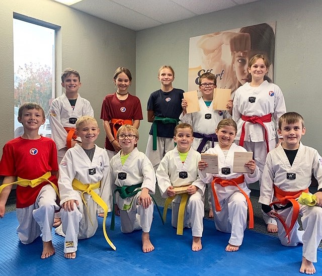 Eleven kids recently passed their belt tests at Sandpoint Martial Arts. Front row (from left): Dante Hindsley (yellow belt), Ezra Mayer (yellow belt), Nick Sloan (green belt), Wyatt Banks (yellow belt), Kaydence Geanetta (orange belt) and Tyce Dunbar (orange belt). Back row (from left): Landon Buoy (orange belt), Evelyn Berrey (orange belt), Molly Sloan (green belt), Eli Parrie (purple belt) and Ella Stevens (red belt).