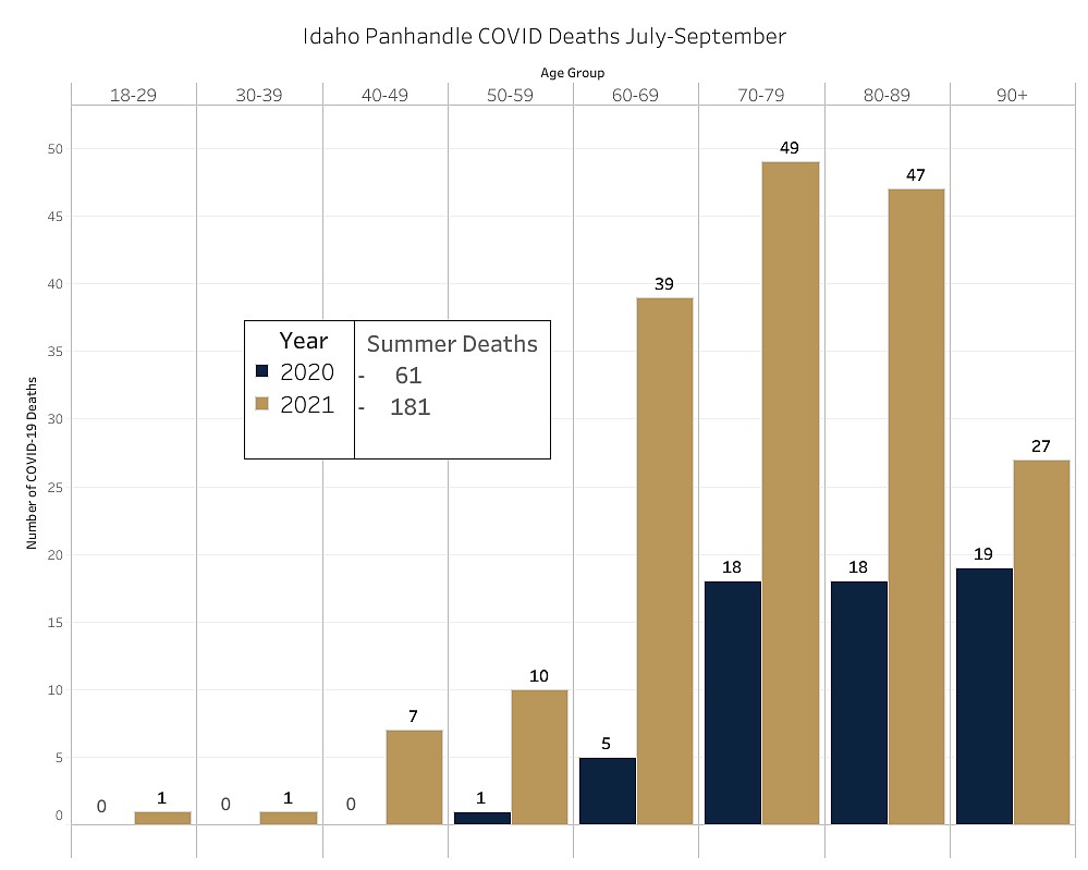 The PHD also recently issued a chart that showed there were 181 COVID-related deaths from July through September. Most of those deaths, 162, or 90%, were people over the age of 60. There were two COVID deaths of people under the age of 40 in that time period.