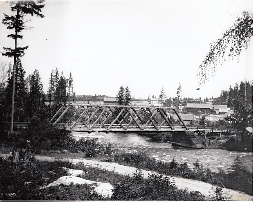 By 1911, the citizens of the burgeoning village successfully lobbied the Flathead County commissioners to build a new bridge in the village. The commissioners awarded the A. Y. Bayne & Company of Minneapolis a contract to construct the bridge on June 21, 1911, for an estimated cost of $4,400. Although the county commissioners awarded the contract in June, it was not until mid-November 1911 that the Bayne Company began construction of the bridge. On November 17th, the Bigfork Flathead County News reported that the bridge crew had arrived in Bigfork and the steel for the bridge was being transported to the construction site from the Great Northern Railway’s terminus at Somers. The article also noted that the original older timber bridge had been condemned by the county.