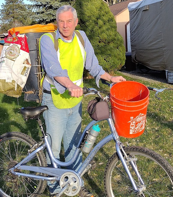 For three hours and six miles a day, year-round, Richard rides his bike, equipped with a 32-gallon garbage can, from his Indian Meadows area home. First, he picks up trash in his neighborhood with a garbage grabber, then heads to Seltice Way, Ramsey Road, the transfer station, Winco and along I-90.