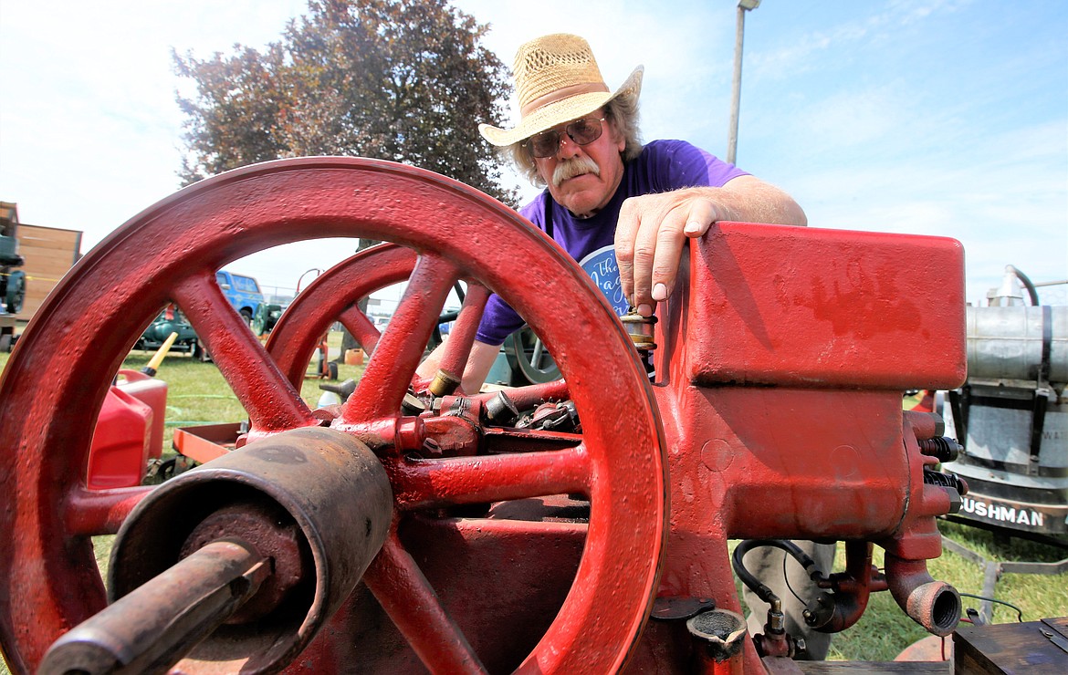 Dennis Dingman has a 1908 engine running a drill press at the fair that he came across in Bonners Ferry. It was rolled over, down a hill, on its side.