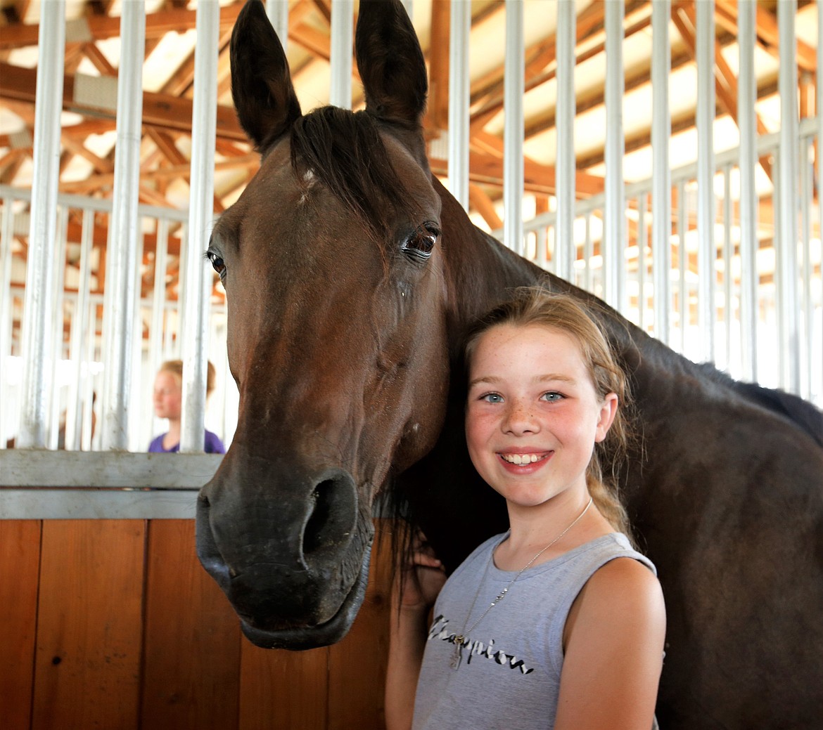 Shelby Roberge of Rathdrum, at the fair with her rescue horse, Liberty, was hungry and decided to jump in. She put up a good fight.