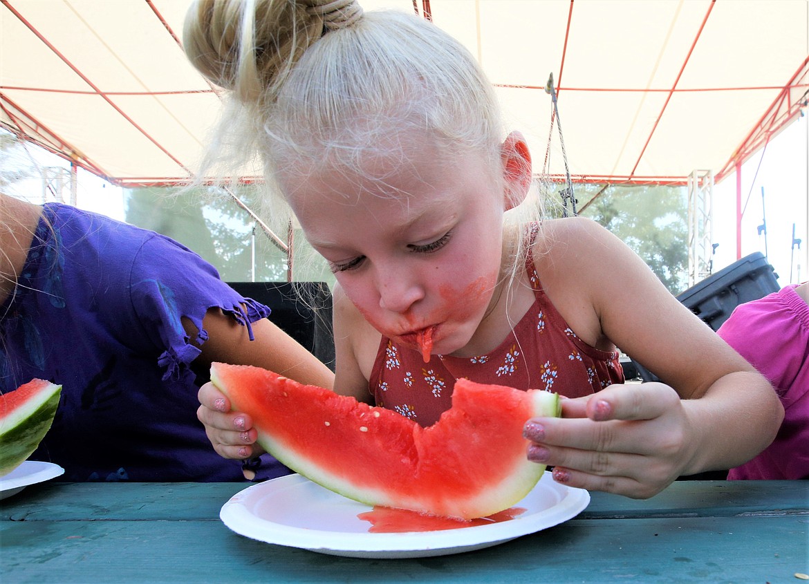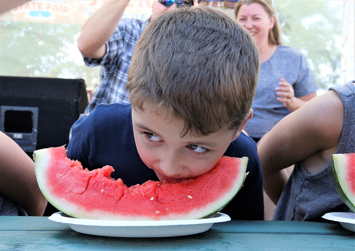 Five-year-old Dominic Carhart of Athol somehow ended up with the biggest piece of watermelon. He had to stop every few bites to get a breath, and still almost won.