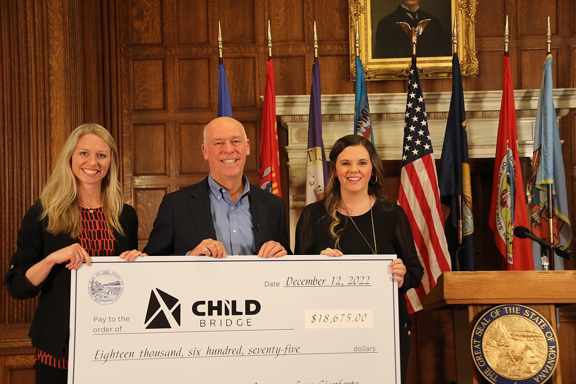 Child Bridge is headquartered in Bigfork with offices across the state. The nonprofit supports children who have been abused and provides training, resources and tools for their foster families. In a small ceremony Monday at the State Capitol, the governor presented a check to Child Bridge executive director Jenna Taylor and Melissa Puyear with the organization’s Helena office.