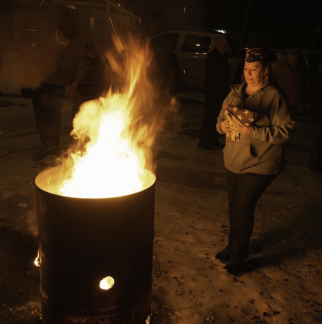 VFW Post members retired 176 U.S. flags, four POW/MIA flags, two Montana flags, two Marine flags, and one each of Army, Navy, Coast Guard, and one Confederate flag, Wednesday evening.