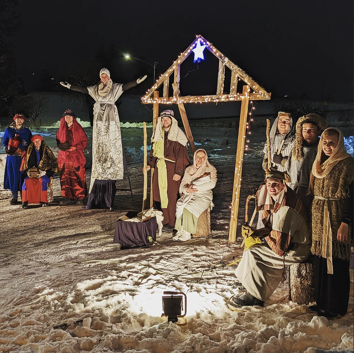 A jolly group of friends in Post Falls set up a nativity scene Monday night along Spokane Street near Terre Coffee.