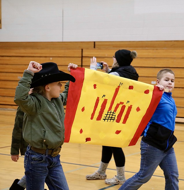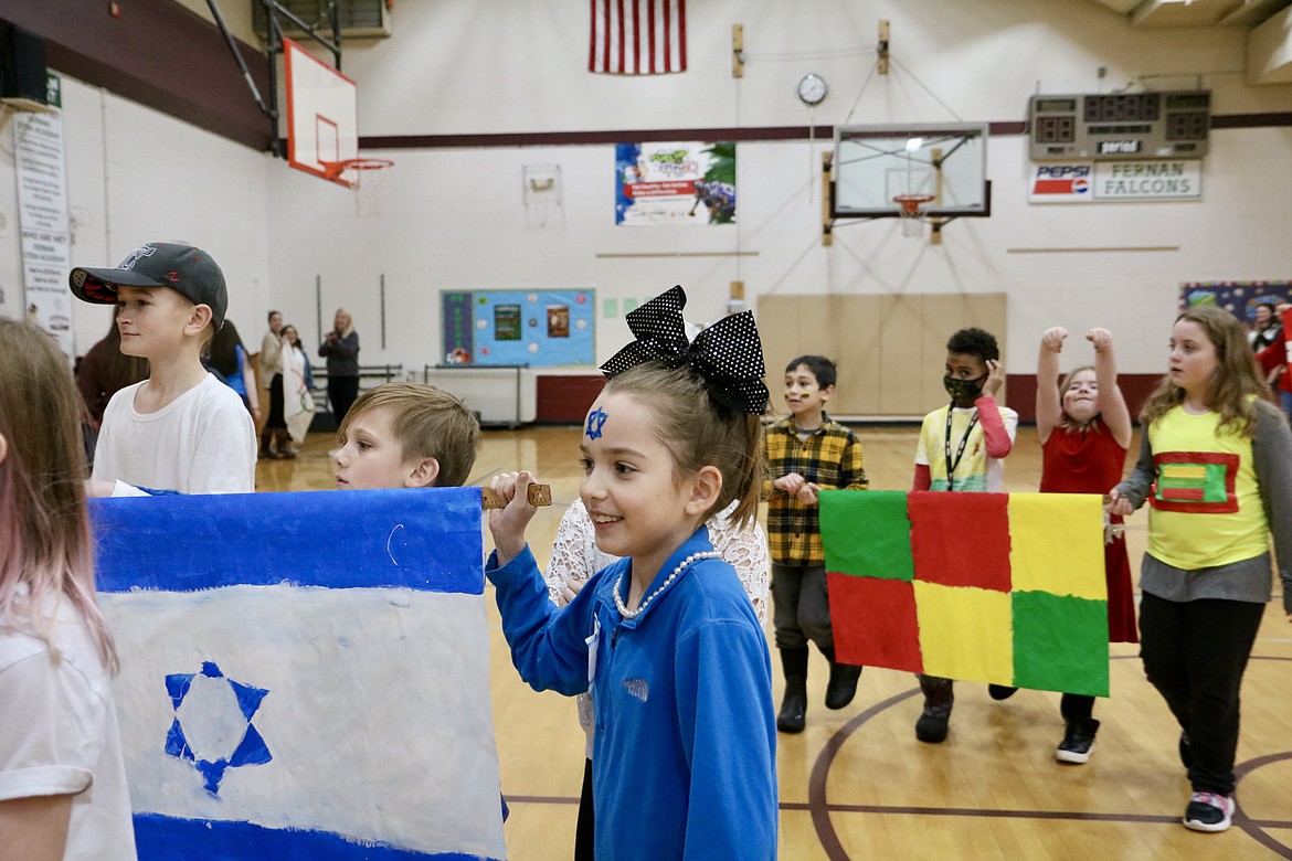 Third through fifth graders, carrying posters representing flags of countries all over the world, paraded through the building to welcome the opening of the 2022 Winter Olympics in Beijing on Friday.