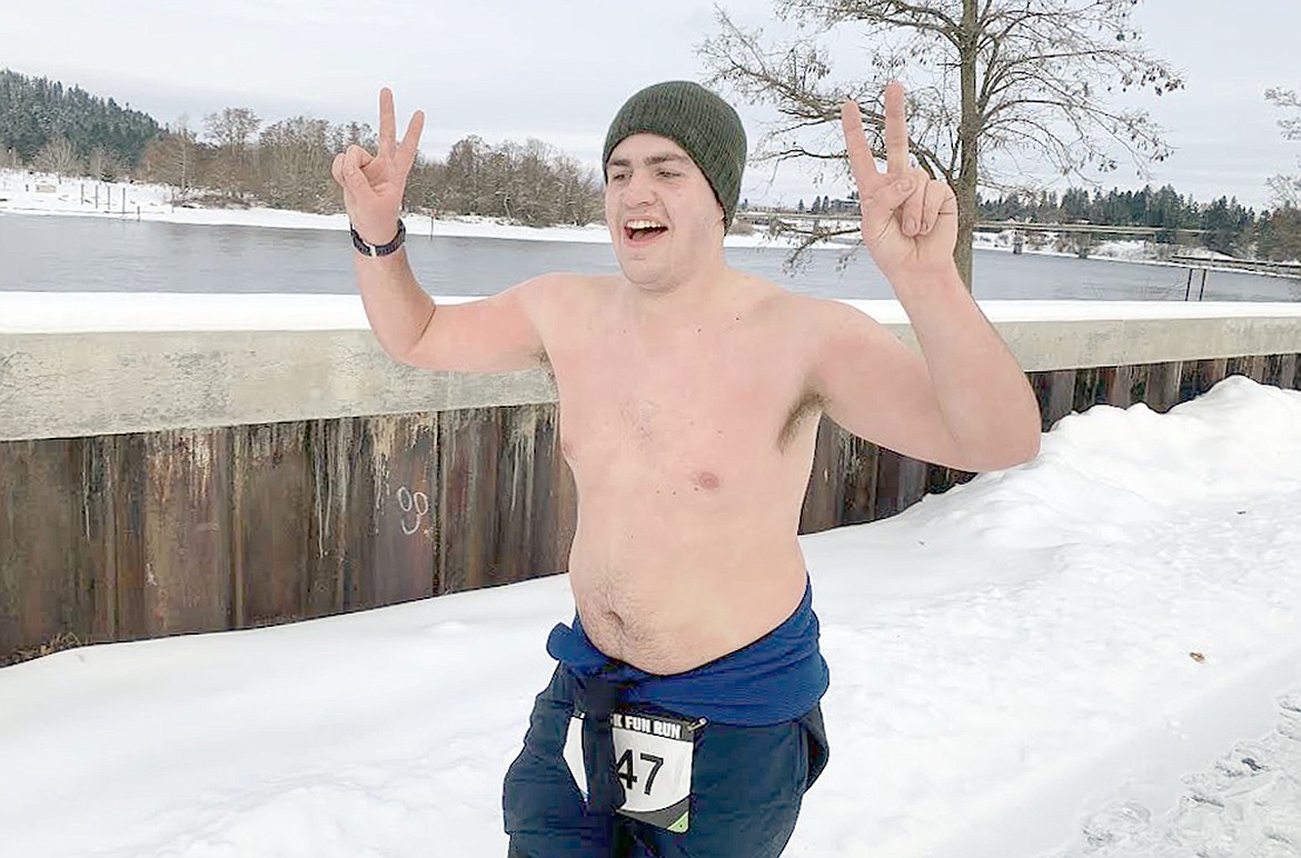 Despite the freezing conditions, the 21-year-old conceded nothing to Mother Nature, insisting on doing it his way, sans shirt, for the 5K course that began and ended at Riverstone Park.