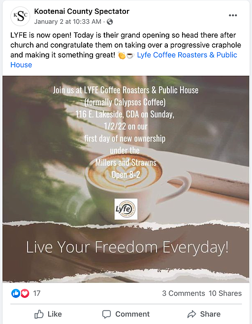 "I hope the hate-filled, mean-spirited comments aired on Facebook toward the owners of Calypso's by far-right individuals who are supporting this new business does not reflect upon the owners of LYFE Coffee Roasters & Public House," said Deborah Rose, a former member of the Kootenai County Republican Central Committee who describes herself as a concerned citizen. "Our community needs more respect encouraged and communicated for our differences, and less disrespect communicated to ensure we have a healthy, prosperous community. I hope all political persuasions will be welcomed to patronize this new business."