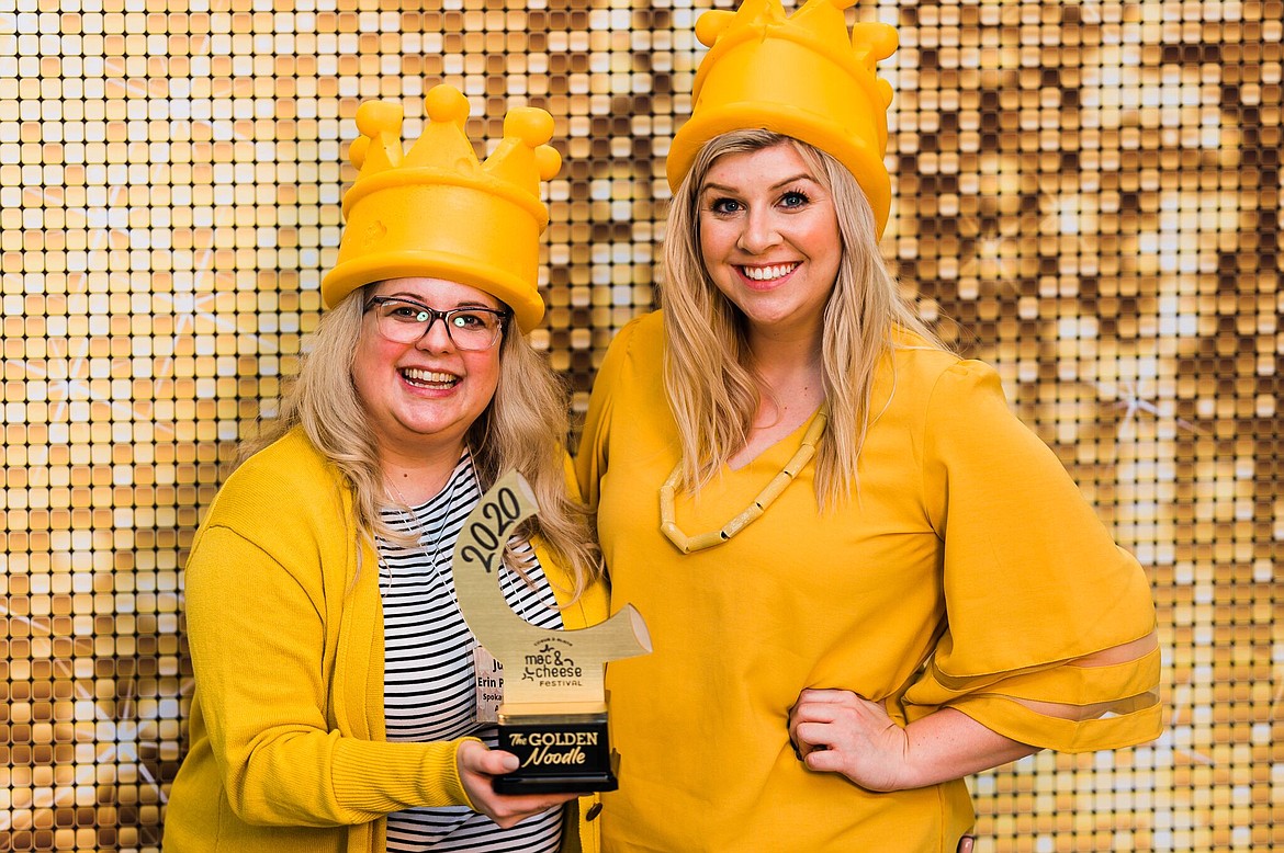 From left, this 2020 photo, Erin Peterson, owner of the Spokane Culinary Arts Guild and one of the Mac and Cheese Festival judges, shows off the Golden Noodle award with Emily Boyd, executive director at the Coeur d’Alene Downtown Association. Photo courtesy of Emily Boyd
