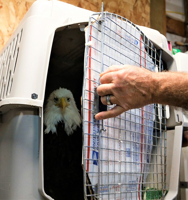 The other, an older male, was hit by a car in the Oldtown area. Fortunately, it had no broken bones and could be back on its way within a few weeks. It peered out when Don Veltkamp opened its crate door so media could see it.