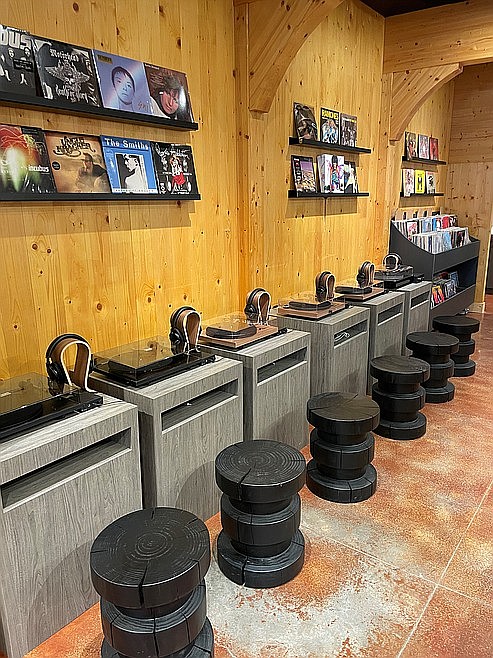 Slow Burn Records partnered with Eyehear Technology Group to create six listening stations in the store so customers can listen to albums before making a purchase. People looking to buy a record player are directed by the store to contact Eyehear.