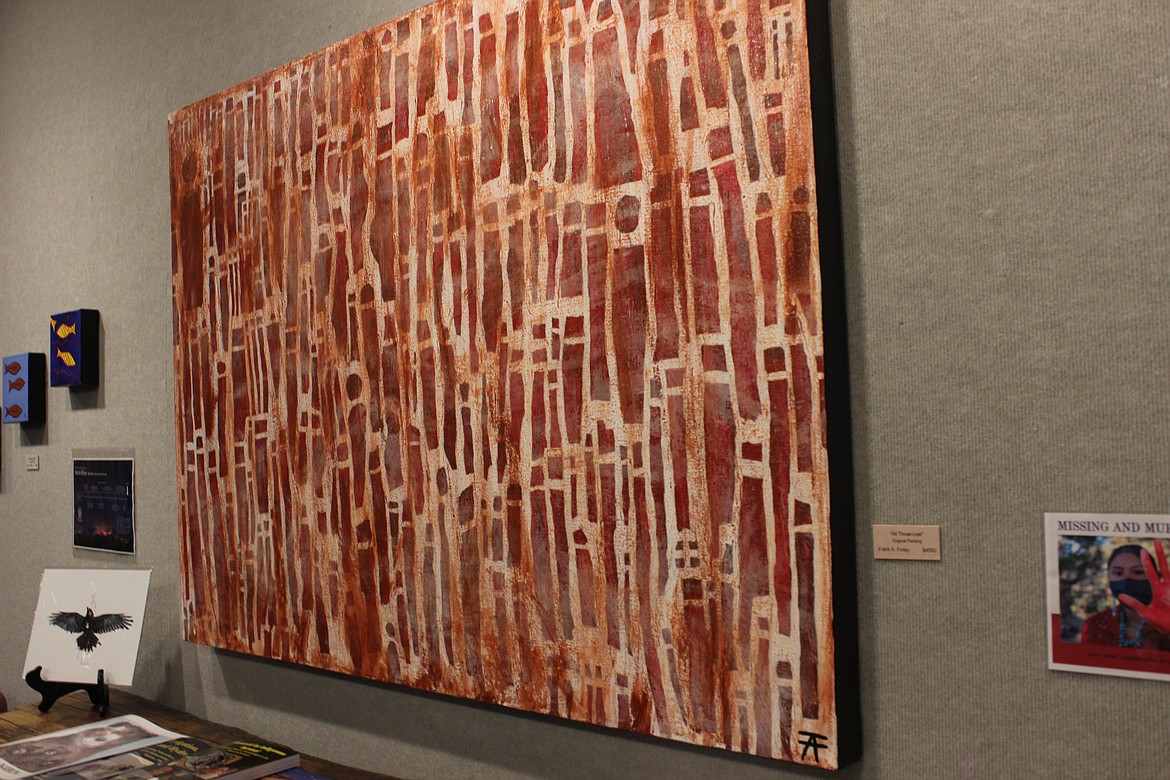 He spoke about the inspiration behind some of the pieces displayed at the BACC. With the painting “All Those Lost,” Finley wanted to draw attention to the issue of Missing and Murdered Indigenous Women. According to the Coalition to Stop Violence Against Native Women, native women face murder rates 10 times the national average. The Montana Free Press reported in July of 2021 that in Montana, Native Americans make up roughly 26% of missing persons cases but account for less than 7% of the state’s population — making them four times as likely to go missing as other residents.