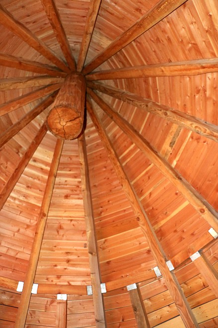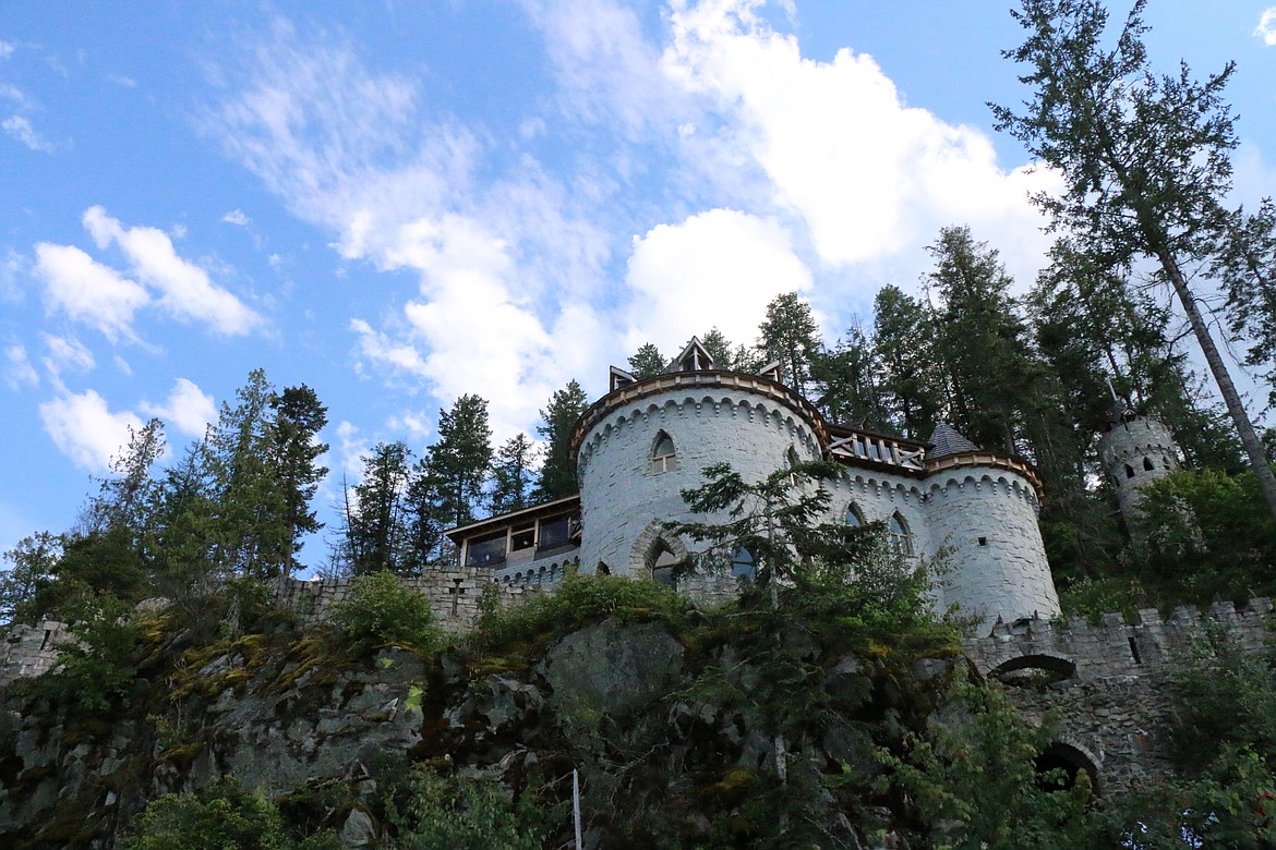 All of the logs, both the fir and the cedar, that were used in construction are from the property. Some of the five different types of stone come from the property, some from a quarry in British Columbia in Canada. As in castles built in the Renaissance and medieval periods, stone serves as both the outside and inside walls. Traditional construction methods were used, with no modern cranes or technology. Scaffolding kept the construction authentic and care was taken to ensure construction was as green as possible.