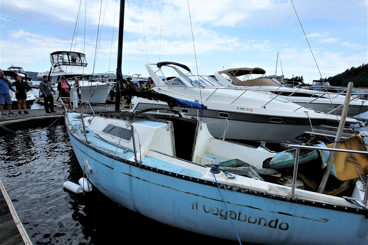 The 24-foot sailboat suffered extensive damage, but did not sink. It belongs to Rich Relyea, who arrived later and was on the phone with his insurance company.